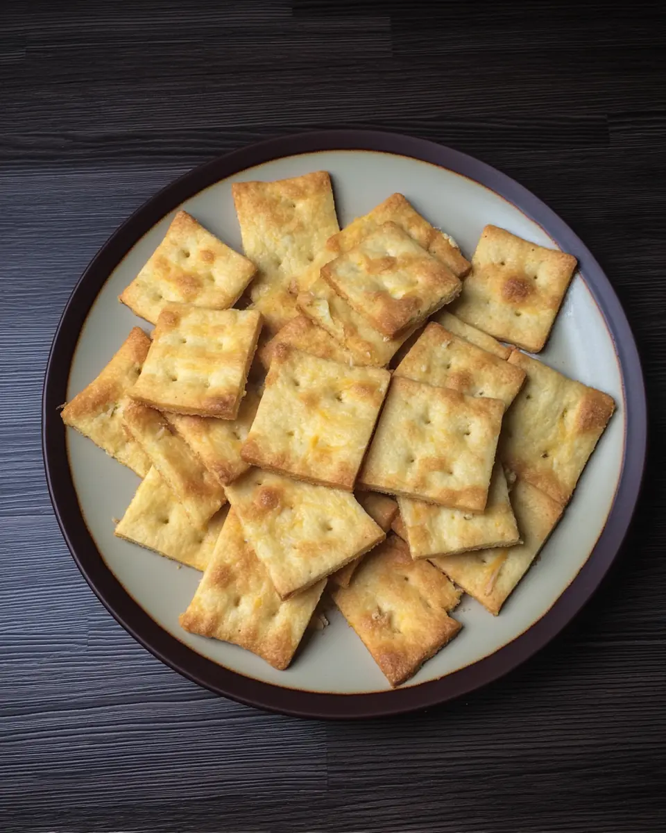 Golden-brown homemade keto crackers made with almond flour and cheddar, served on a white plate with leaf detailing.